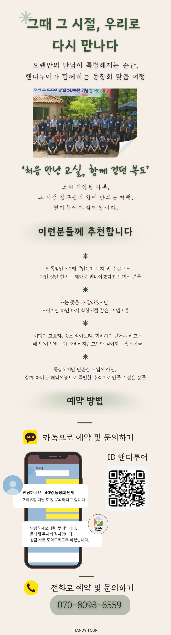 핸디투어는 오랜 친구들이 다시 만나는 여행을 가장 자연스럽게 만들어드립니다.