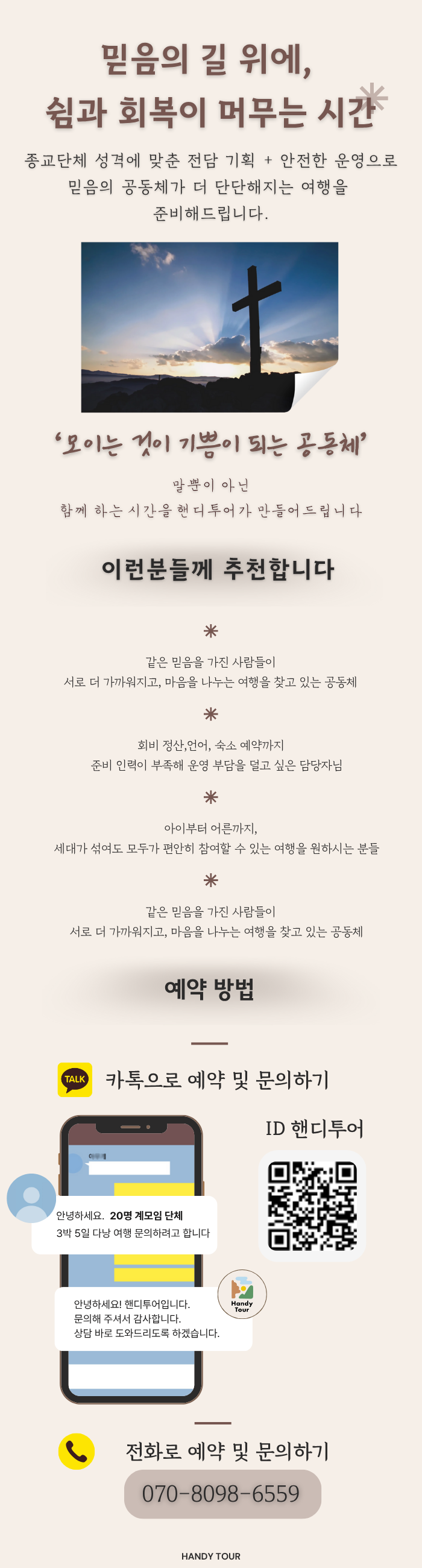 핸디투어는 안전·여유·공동체 시간을 우선으로 설계합니다.