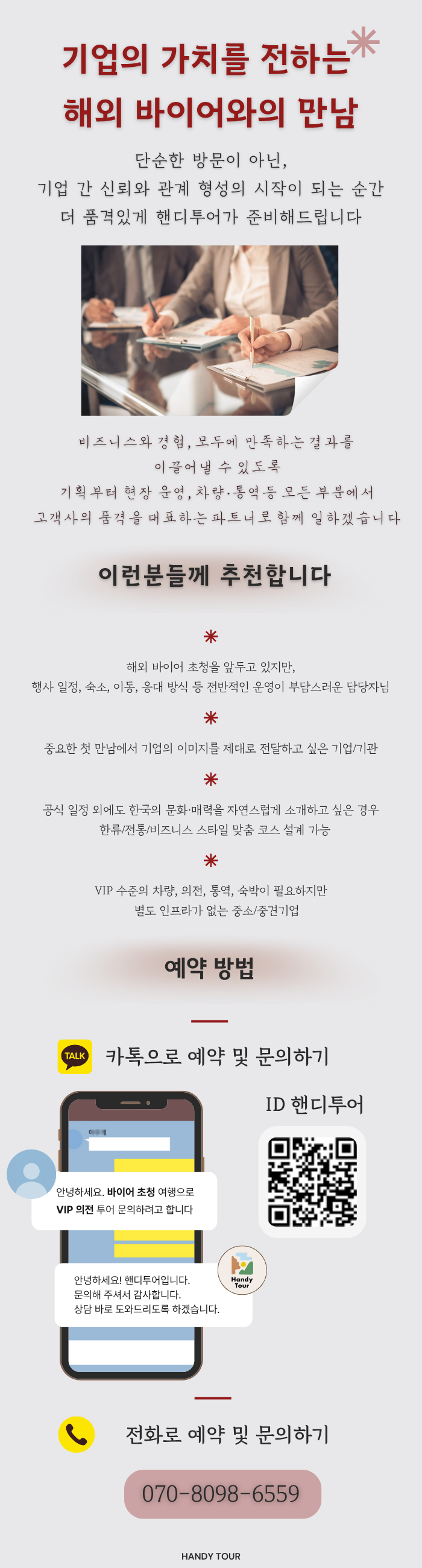 핸디투어는 비즈니스 성과를 위한 일정 + 한국 경험 제공의 두 가지 목표를 동시에 충족시킵니다.