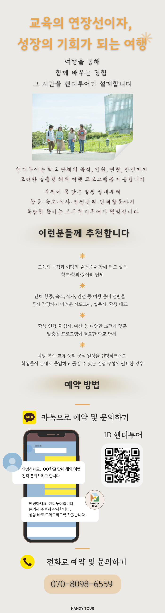 핸디투어는 학생 안전·학습 목적·경험 중심 일정에 최적화된 프로그램을 제공합니다.