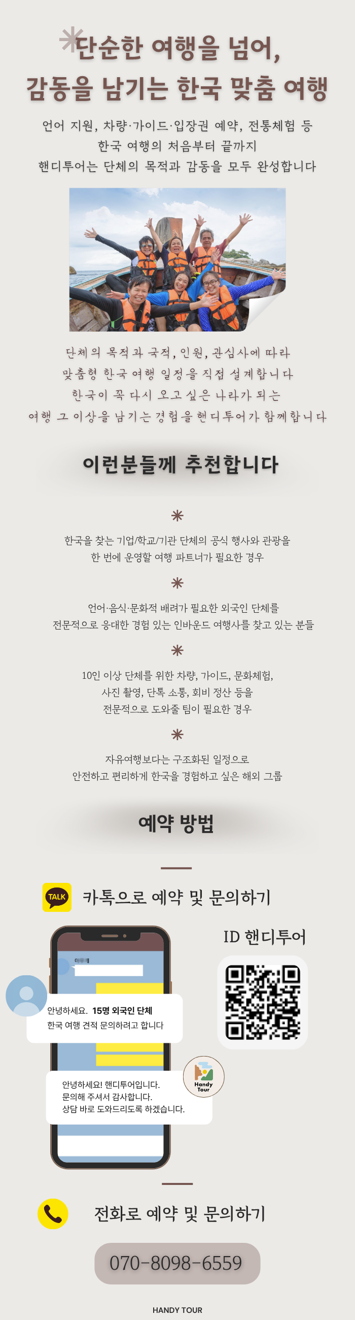핸디투어는 해외 VIP·기업·관광객까지 언어·문화·관광 동선·식사 스타일을 모두 고려한 전문 인바운드 운영을 진행합니다.